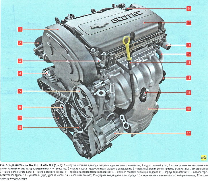 Двигатель внутреннего сгорания (ДВС) Шевроле Авео 2012 состоит из нескольких ключевых систем и компонентов:
