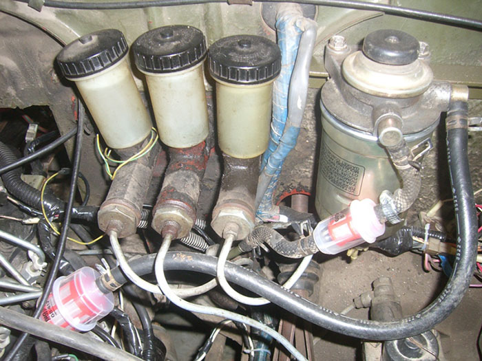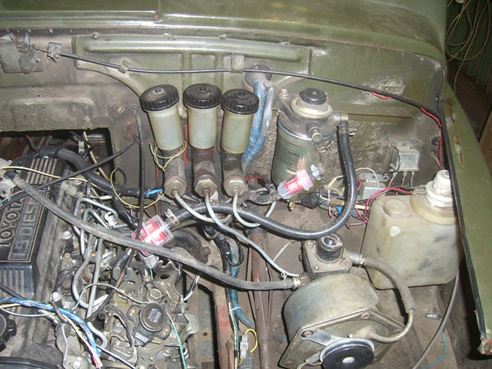 Родной бензопровод был демонтирован. вместо него, по временной схеме, через салон был пущен топливопровод снятый с Toyota LandCruiser Prado. На место почившего в бозе коммутатора, была установлена помпа ручной подкачки с топливным фильтром и датчиком воды:
