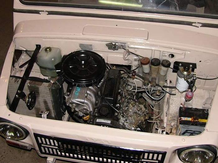 Многие самодеятельные конструкторы не стесняются изменить внешний вид машины и удлиняют капот. Простейший вариант – нарастить лишь центральную часть, добавив выступ, в который в этом случае помещают даже внушительный радиатор от Нивы. Продлевают владельцы и весь капот. Порядка восьми дополнительных сантиметров достаточно, чтобы установить под капот ЛуАЗа «жигулевский» мотор, а перед ним – радиатор вместе с вентилятором и диффузором.