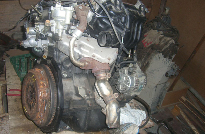 Эти два параметра совпали случайно, это был единственный 1N в городе, продаваемый на тот момент, но я радовался, потому, что от покупки турбованного на тот момент бы отказался. Почему? Я, также как и Андрей-24, шарахался тогда от турбованных двигателей, считая их крайне ненадежными, сейчас я смотрю на вещи иначе, но об этом после.Итак, морозным январьским воскресеньем, при помощи паяльной лампы был разогрет и заведен 969-й двигатель в ЛуАзе, последний заехал в теплую мастерскую и приготовился к экзекуции. Передо мной же стояла нелегкая задача по подбору нужных запчастей. Была заказана во Владивосток корзина а также маховик для механической КПП 1N, начался поиск необходимого выжимного, а также были заказаны детали к нему. Все это подробно описано в статье Андрея-24, поэтому повторятся не буду. Но самое главное переходная плита. Поиск специалистов, готовых ее изготовить начался тогда же, а сама плита появилась у меня аж в апреле! Как хорошо, что сейчас можно просто позвонить и заплатить, тогда пришлось здорово помучаться. Вот так выглядел 1N со снятыми лишними деталями и подготовленный к установке маховика и корзины: