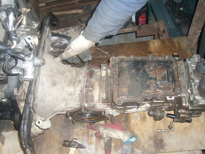 Предварительно надо было снять ее, масло (какое-то подобие мазута) слить, промыть соляркой, заменить передний сальник. При промывке коробку крутил 600-ваттной дрелью через кусок резинового шланга, советую всем!
