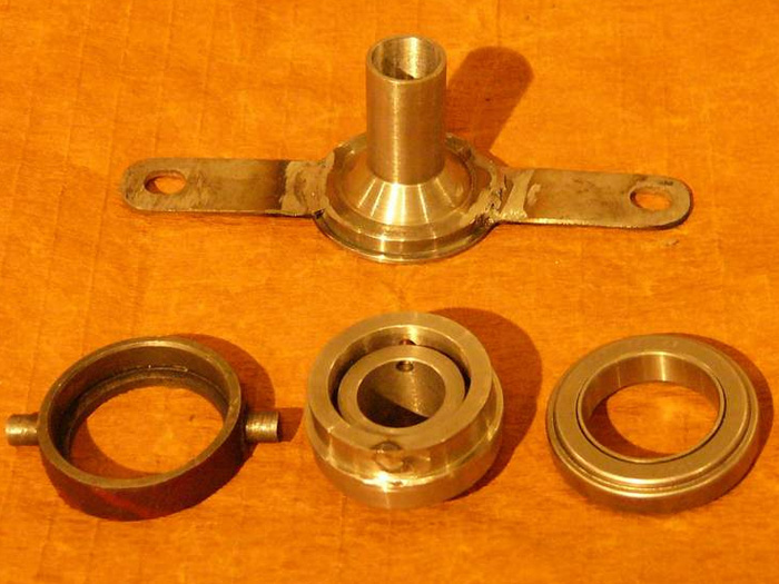 Изготовил по месту сам описанным далее способом. Сначала на стапеле-тележке сочленил двигатель и коробку. Сцепление центрировал старым первичным валом. Коробка весит немного, а двигатель тяжеловат. Чтобы точно подогнать узел сцепления, из пластилина сделал я вспомогательное измерительное кольцо. Вывел сцепление регулировочным болтом в среднюю точку, и потом стянул двигатель и коробку с установленными уже диском сцепления, корзиной сцепления и узлом выжимного, но пока без подшипника. На его месте использовалось вспомогательное кольцо из пластилина. Пластилин деформировался при стяжке и дал размер, по которому я и изменил держатель выжимного подшипника.