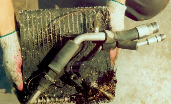 2. Загрязнение. Одна из частых причин выхода из строя. Игнорирование автолюбителем автомойки очень быстро приведет к коррозии конденсора, магистральных трубок. Объясняется это довольно просто. Под слоем грязи начинаются химические процессы, разъедающие металл. Постепенно он истончается, меняет свою химическую структуру и вот уже «где-то зашипело-засвистело».