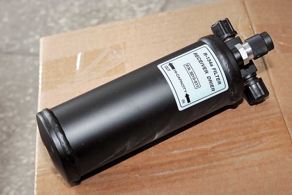 - Ресивер – осушитель в виде вертикального бачка. Устанавливается в подкапотном пространстве неподалеку от конденсора.