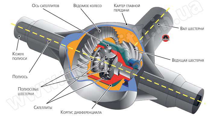 Дифференциал дает возможность ведущим колесам вращаться с разной угловой скоростью. Корпус дифференциала жестко связан с ведомым коническим колесом (большего размера). В корпусе дифференциала установлены две шестерни, которые с помощью полуосей (заднеприводная компоновка) или специальных валов (переднеприводная компоновка) связаны с ведущими колесами автомобиля. Между этими шестернями в постоянном зацеплении с ними расположены две или четыре шестерни-сателлита, оси которых жестко связаны с корпусом дифференциала.