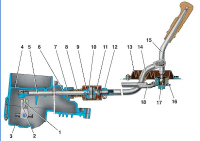 Привод управления коробкой передач состоит из рычага 15 (рис. Привод переключения передач) переключения передач, шаровой опоры 17, тяги 14, штока 5 выбора передач и механизмов выбора и переключения передач.